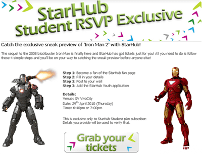 oh ya, tse hwee just got lucky recently! so rare huh.. happened to come across this Iron Man 2 advert on FB and you just had to follow those simple 4 steps to get a chance to win the movie tickets. guess what? i actually got it!! *laughs* initially when the Starhub person called me, i thought it was like a prank by a friend or something. then i came to realise it was real. hahah. just a pair only though and i’ve no one to go with so…. gave them away to my colleague! hopefully she’ll enjoy it with her hubby. shall catch it, probably with the guys, after their exams next week. ((: